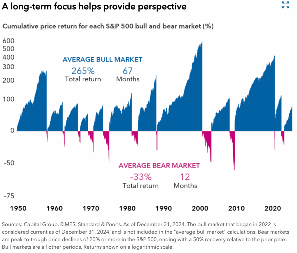 Between 1950 and 2024, the S&P 500 saw 11 major bear markets. The average decline? 33%. But bull markets gained an average of 265%.